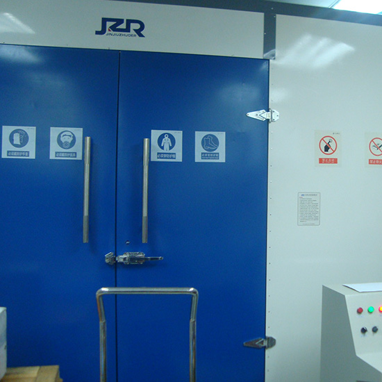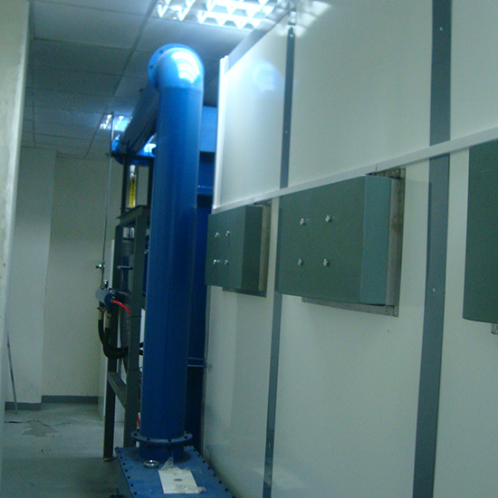 室 體?:室體外壁采用巖棉復合保溫板,內部使用耐磨橡膠板,確保在噴砂過程中保護室體不受損壞。室體兩側設有對開式大門,頂部設有進風百頁窗和消聲裝置?